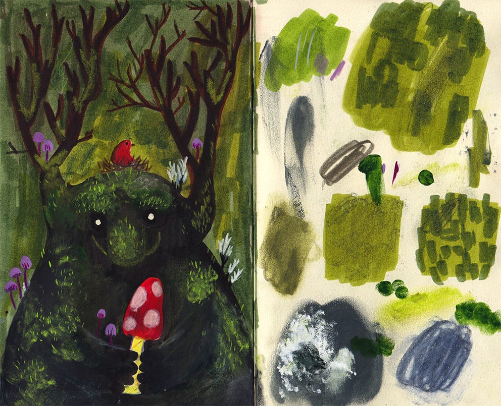 I really connected with this clear concept on how creativity works, and it helped me work through feelings of shame I had about copying. For me to copy something was the opposite of being creative, but to link it to learning makes so much sense to me. This process of Copy, Transform, Combine is exactly how my Folktale week illustrations came about. At the start of a project I sometimes make a mood board, sometimes in my sketchbooks, sometimes on Pinterest. I was looking for inspiration on forest spirits on the old google when I came across the image below by Vasilia Romanenko and started to doodle in my sketchbook.
