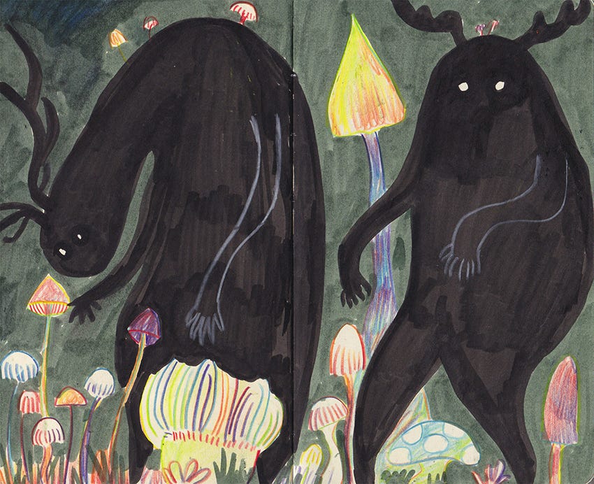 As you can see, the first image I created is quite a clear copy of Romanenko’s forest spirit, combined with my love for mushrooms and the magic pencil I had just bought. Making this drawing started the little fire of inspiration and motivation in me, as is usually the case when I just start something (’Just do it’ being an apt slogan for my practice).